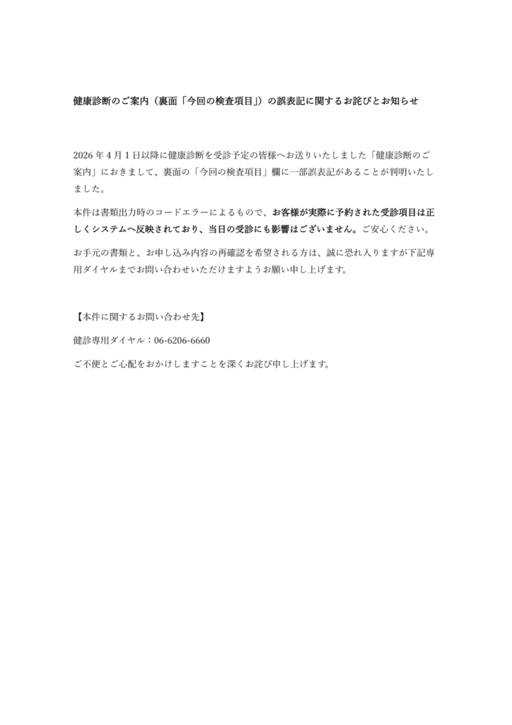 健康診断のご案内(裏面「今回の検査項目」)の誤表記に関するお詫びとお知らせ