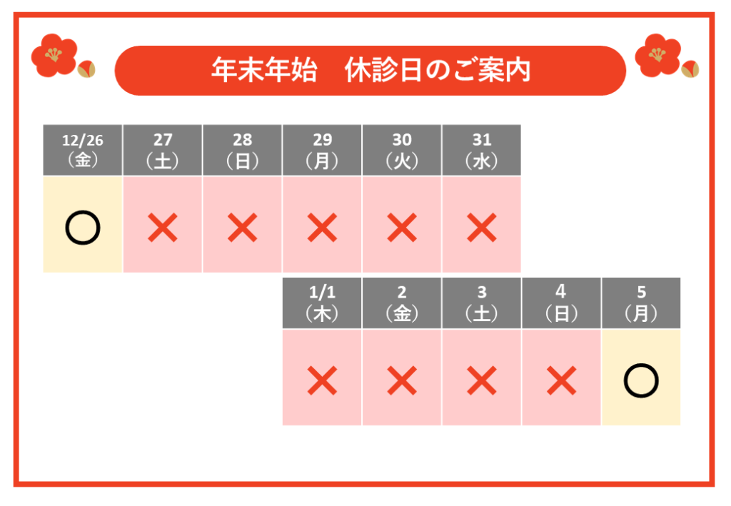 年始は、2026年1月5日(月)より通常通り診療いたします。
