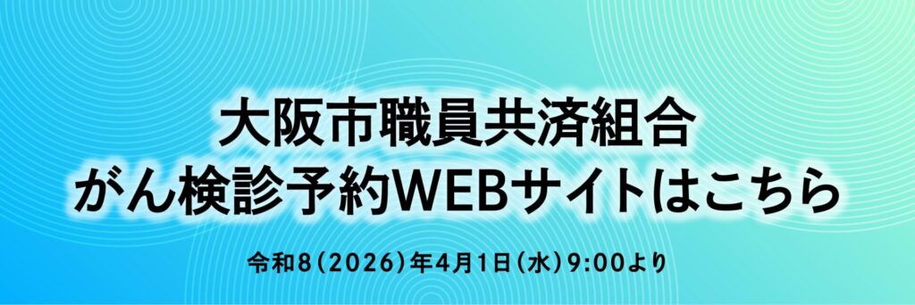 2026.03.23 大阪市職員共済組合 がん検診のご予約について 大阪市職員共済組合 がん検診のご予約については 以下バナー画像をクリックしてお進みください。 【WEB予約受付】 4月1日(水)9:00 ~ 5月31日(日)23:59まで ※WEB予約には、会員登録が必要です。 ※4月1日(水)8:59まではアクセスいただいても、ご予約できません。 ※すでにお申し込み済の方で、6月1日(月)以降に内容・日時変更をご希望の場合は 「TEL:06-6206-6660(電話受付時間 土日祝のぞく9:00~17:00)」までお電話にてご連絡ください。